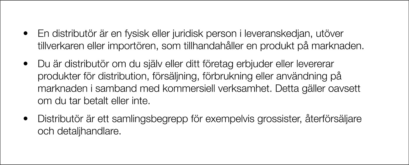 - Du är distributör om du själv eller ditt företag erbjuder eller levererar produkter för distribution, försäljning, förbrukning eller användning på marknaden i samband med kommersiell verksamhet. Detta gäller oavsett om du tar betalt eller inte.